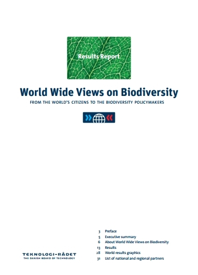 WWViews on Biodiversity is the result of a unique cooperation between CBD, the Danish Ministry of the Environment and the Danish Board of Technology. Participants in the 34 day-long meetings across the world, which were held on September 15th, 2012, were non-expert citizens selected to reflect the demographic diversity in the respective countries and regions. Using unbiased information about biodiversity and policy measures to stop its decline, participants deliberated with their fellow citizens and voted on alternative answers to 18 predefined questions.