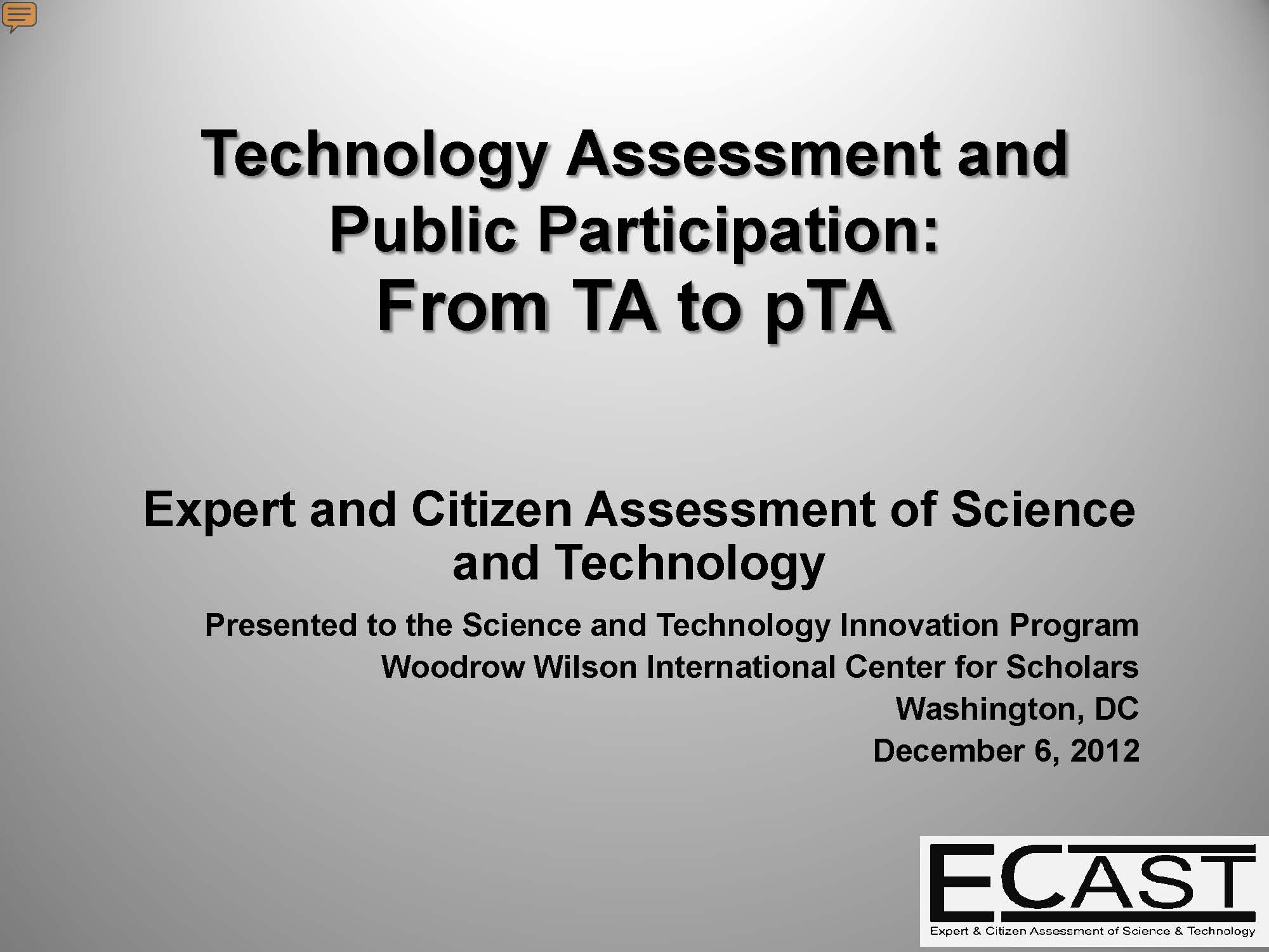Report from that project, Technology Assessment and Public Participation: From TA to pTA will be released at a special briefing event on Dec. 6, 2012 in the fifth floor conference room at the Woodrow Wilson International Center for Scholars, Washington, DC. It will address the state of pTA in the U.S. with some reference to other countries, and focus in particular on WWViews as a case study to explore the strategies and capabilities of ECAST addressing the question: What role can a distributed network play in conducting and institutionalizing pTA in the U.S.?