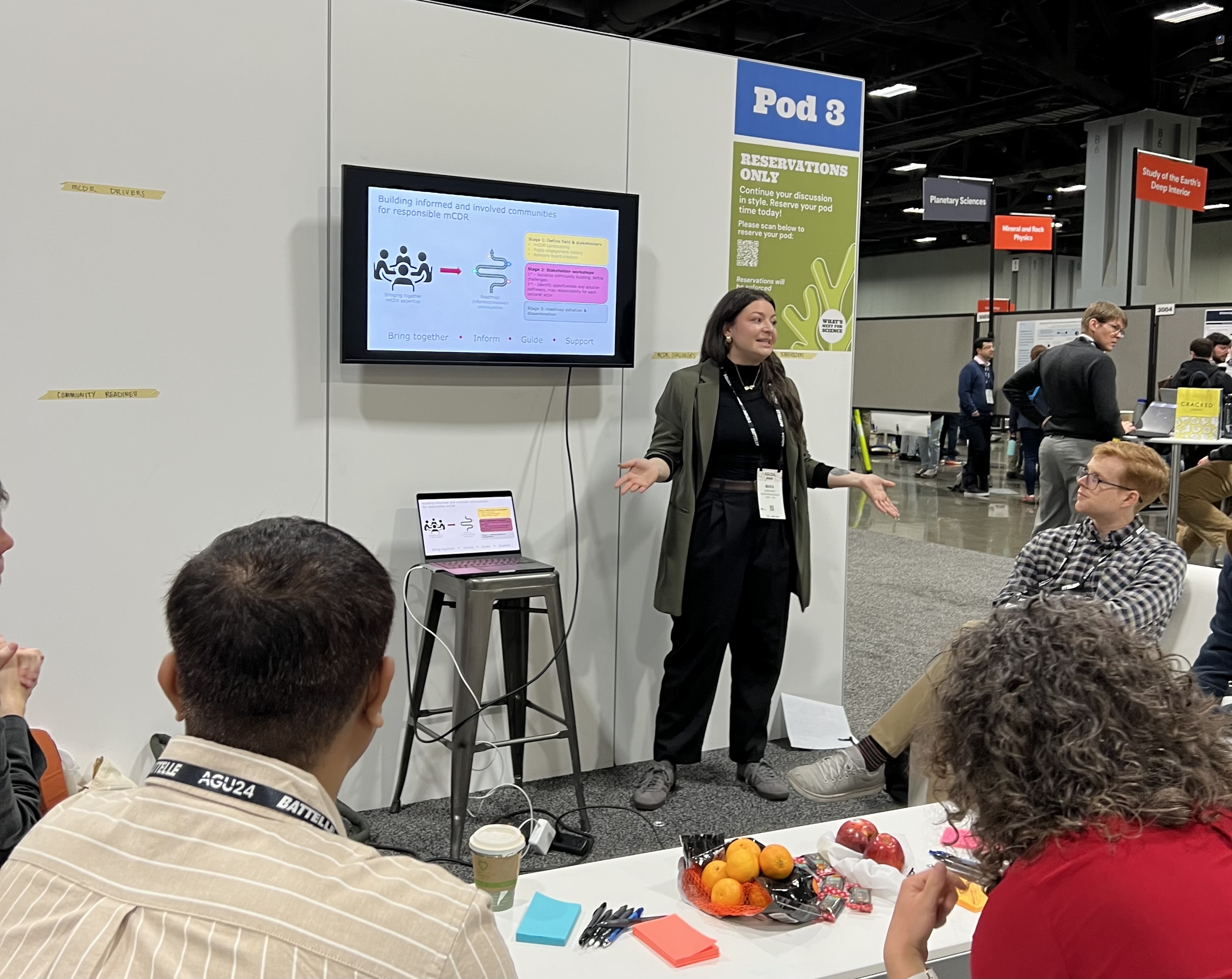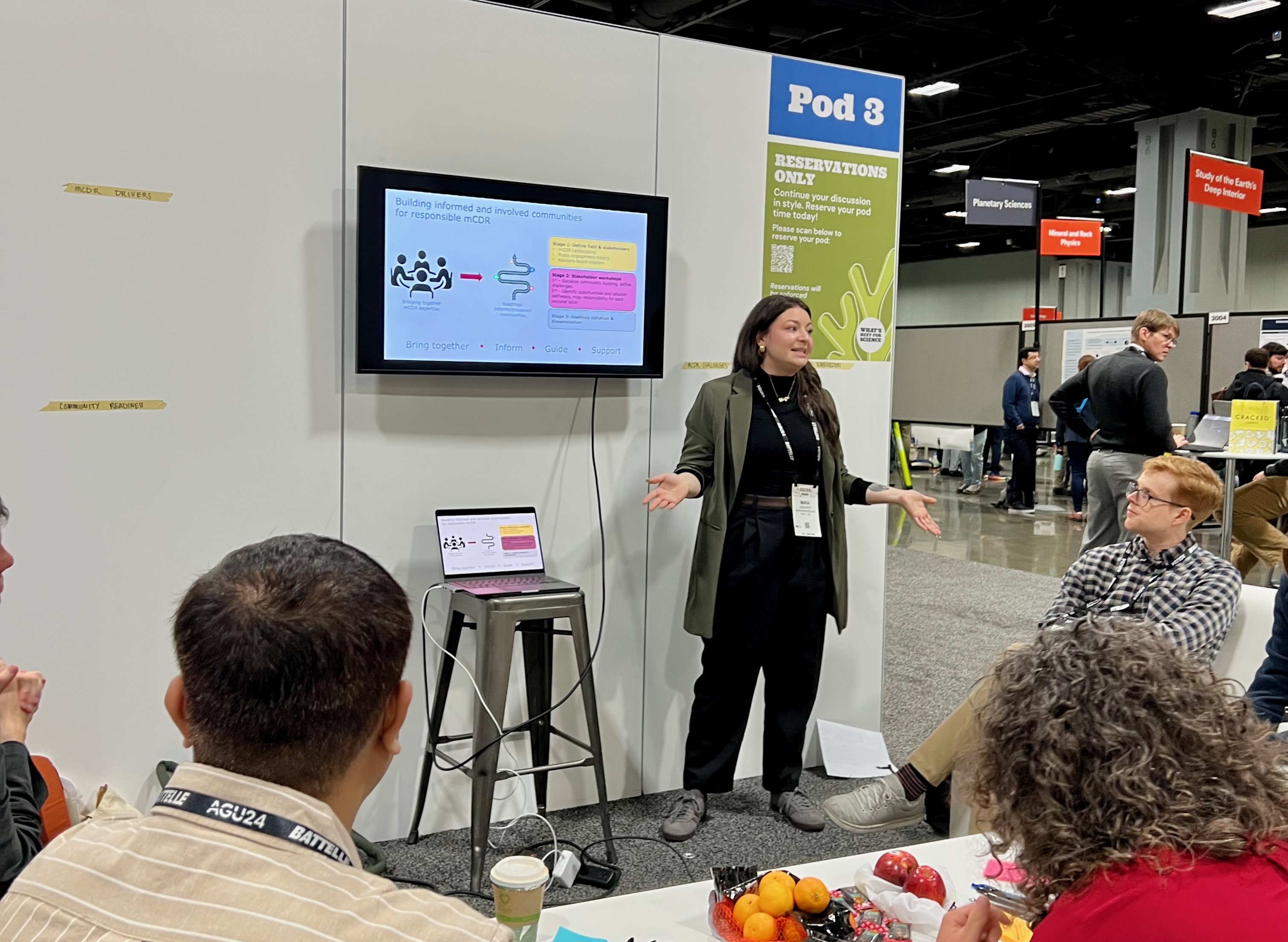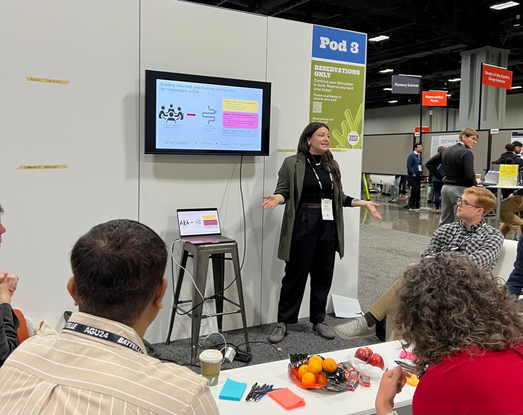 Recognizing this challenge, the Consortium for Science, Policy & Outcomes (CSPO) team members—Amanda Borth, Mara Karageozian, and Emily Hostetler—hosted community listening sessions at AGU about the future of CDR public engagement. CSPO organized three sessions linked to NSF-funded initiatives, including a Workshop Series for Marine Carbon Dioxide Removal and planning for a Research Center focused on Participatory Governance of Climate Intervention Technologies. For the sessions, the CSPO team used AGU’s “Pod” speaking spaces – informal conversation spaces similar to a living room for science, complete with cozy couches. The comforting and inviting spaces were ideal for bringing folks together and opening dialogue among a broad group of participants. Notably, the ‘Pods’ created a space where conference goers could still engage in stimulating, innovative thinking and reconnect with colleagues in an informal space to complement the more formal presentation and poster sessions.